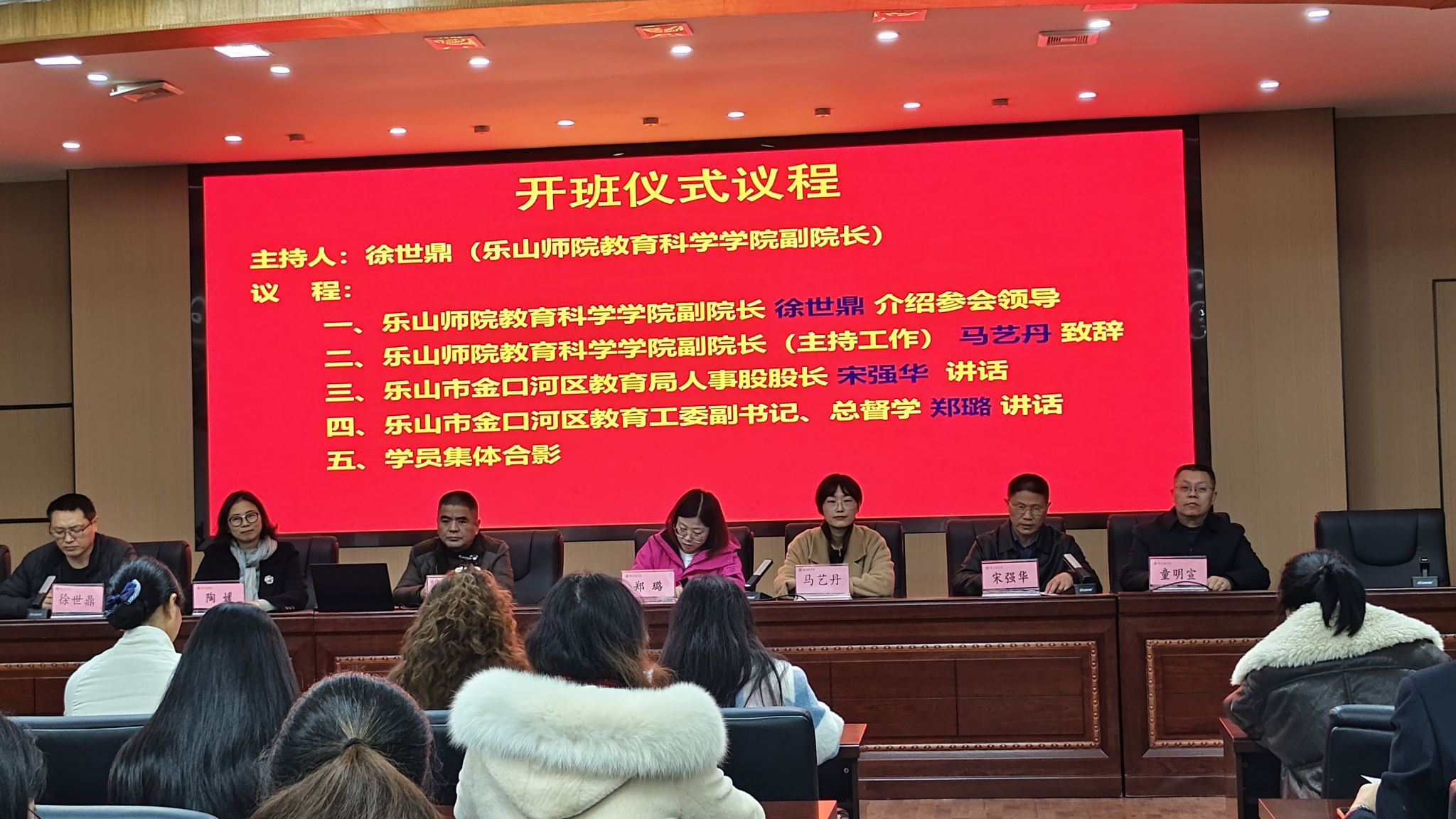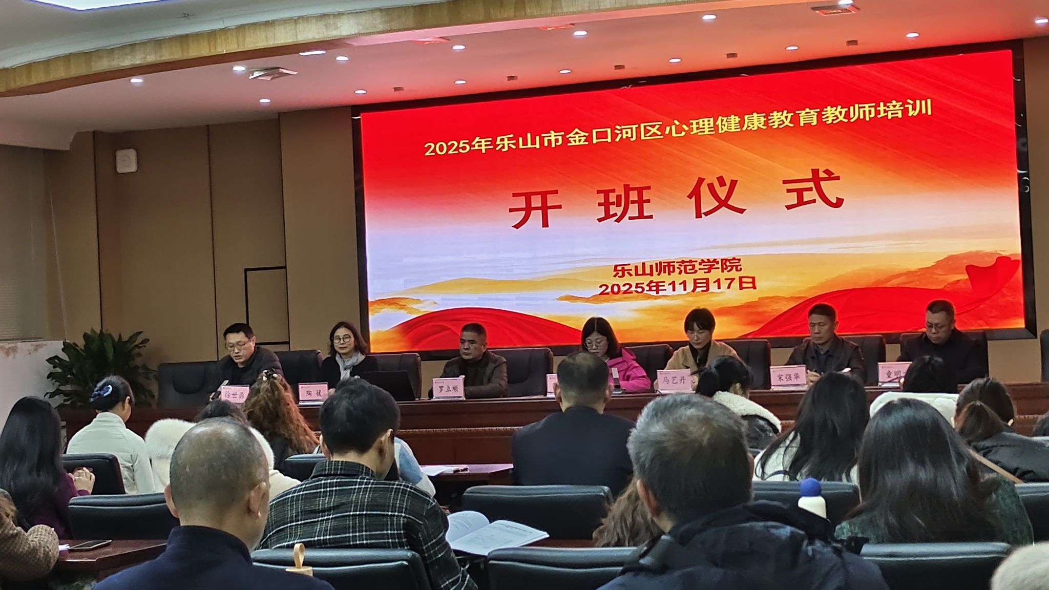 本网讯(图/文、朱玉林)2025年11月17日,由乐山师范学院教育科学学院承办的“2025年金口河区教师心理健康教育能力提升培训”开班仪式在弘毅楼中干会议室701顺利举行。乐山师范学院教育科学学院党委书记罗立顺、党委学生工作部副部长陶媛、教育科学学院院长马艺丹、教育科学学院副院长徐世鼎,乐山市金口河区教育工委副书记郑璐、金口河区教育局人事股股长宋强华、人事股副股长童明宣,以及来自金口河区的120余名学员参加了此次开班仪式。开班典礼由乐山师范学院教育科学学院副院长徐世鼎主持。